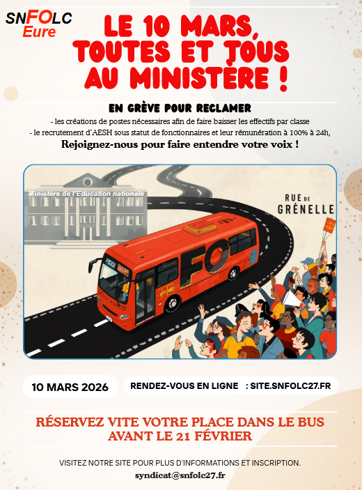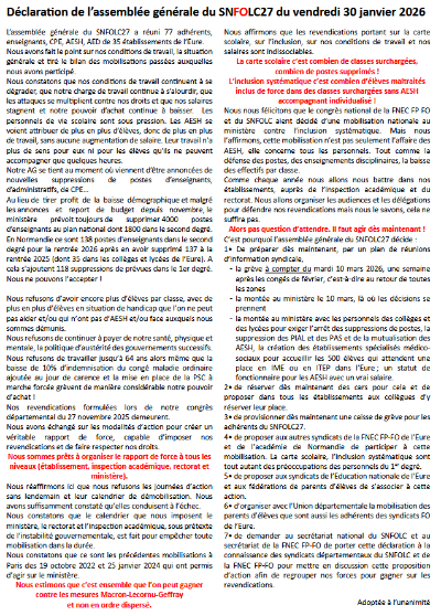 La FNEC FP FO 27 appelle donc les personnels à se réunir avec leurs syndicats, à prendre position pour annoncer leur refus d’appliquer cette réforme et d’exiger son abrogation.