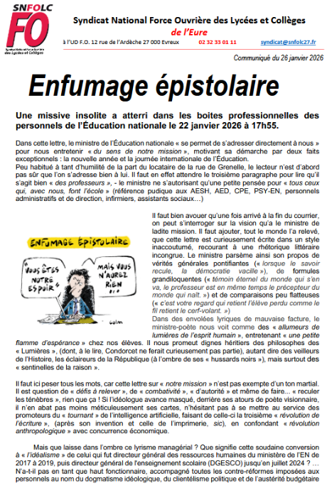 Une missive insolite a atterri dans les boites professionnelles des personnels de l’Éducation nationale le 22 janvier 2026 à 17h55...