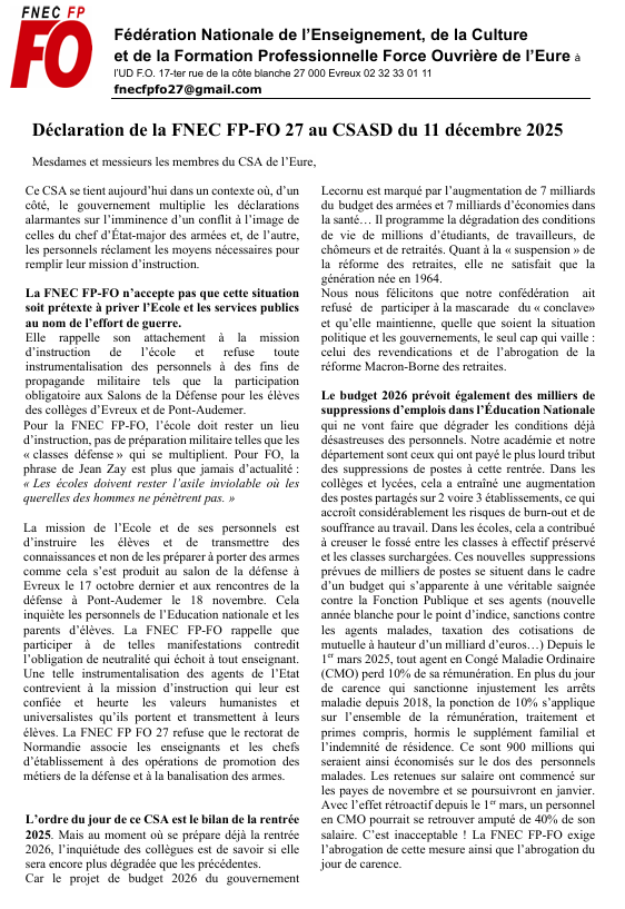 Vous trouverez ci-contre la déclaration de la FNEC FP-FO-27 au CSASD